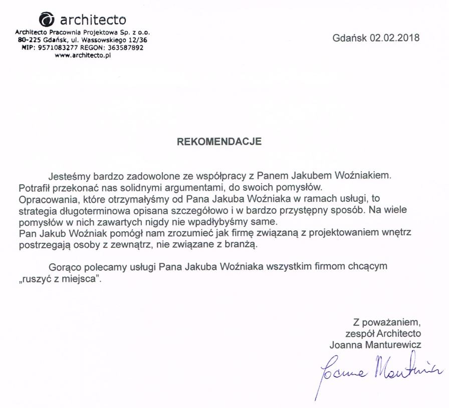 Pomogłem stworzyć spójny i przyjazy wizerunek marki pracowni architektury wnętrz Architecto. Dobór kolorów, deseni, motywów graficznych wraz z odpowiednią typografią sprawił, że marka od progu budzi zaufanie. Wizerunku dopełnia stworzone przeze mnie hasło: „Wnętrza dobrze nastrojone”.